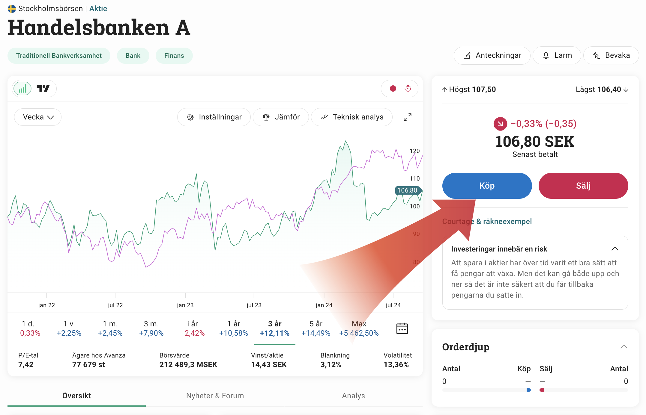SHB kan handlas hos både eToro och Avanza. Värt att notera är att bolaget har två typer av aktier, “SHB A” och “SHB B”. Den förstnämnda är deras A-aktie och den andra deras B-aktie. Längre ner i denna guide visar vi hur du köper deras A-aktie på 5 minuter. Läs mer i kapitel 5.