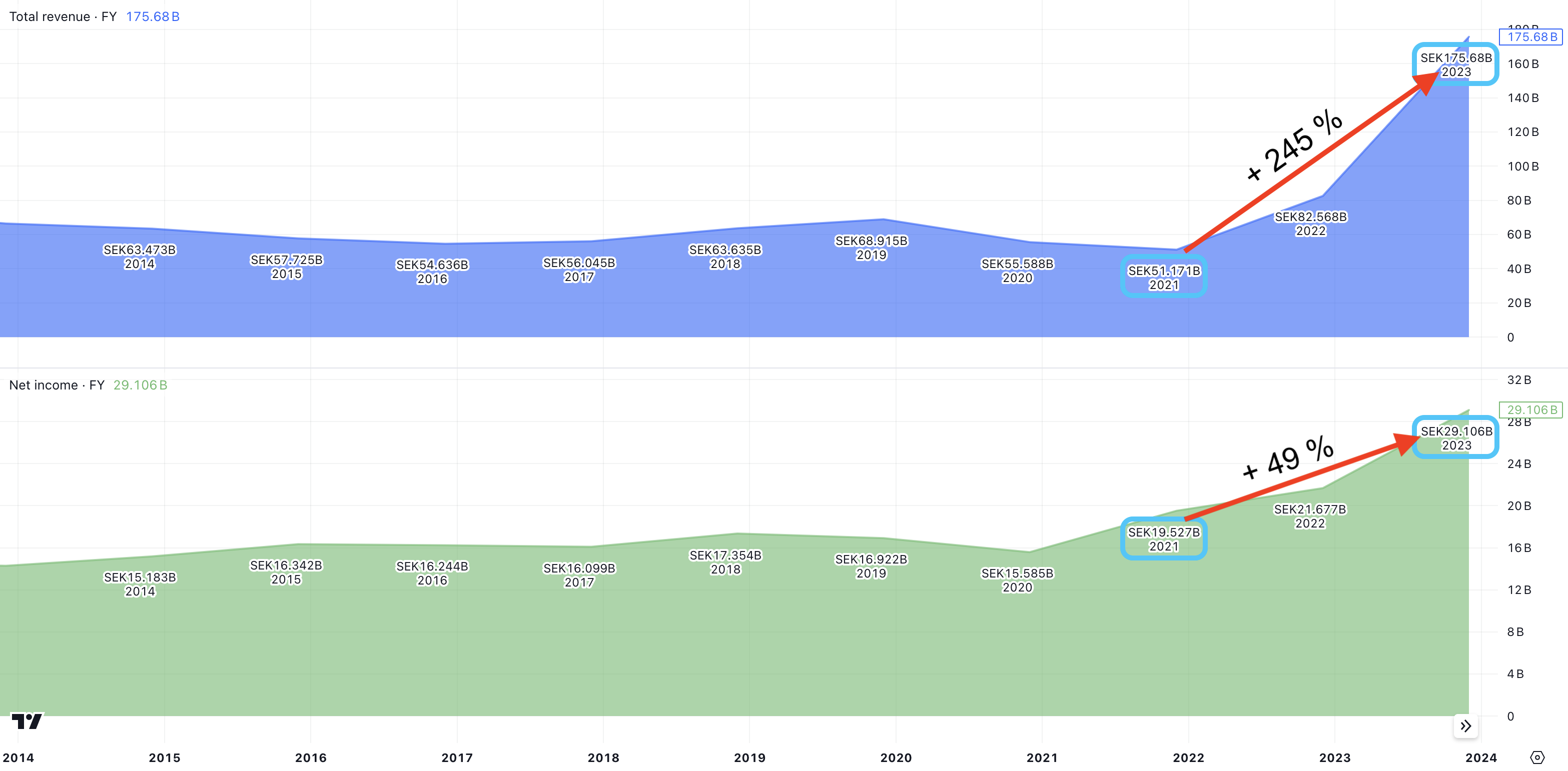 Omsättningen ökade med 245 %, samtidigt som vinsten ökade med 49 %, mellan 2021 och 2023. Under samma period valde SHB att samtidigt höja sina utdelningar markant (se graf under kapitel 4.2).