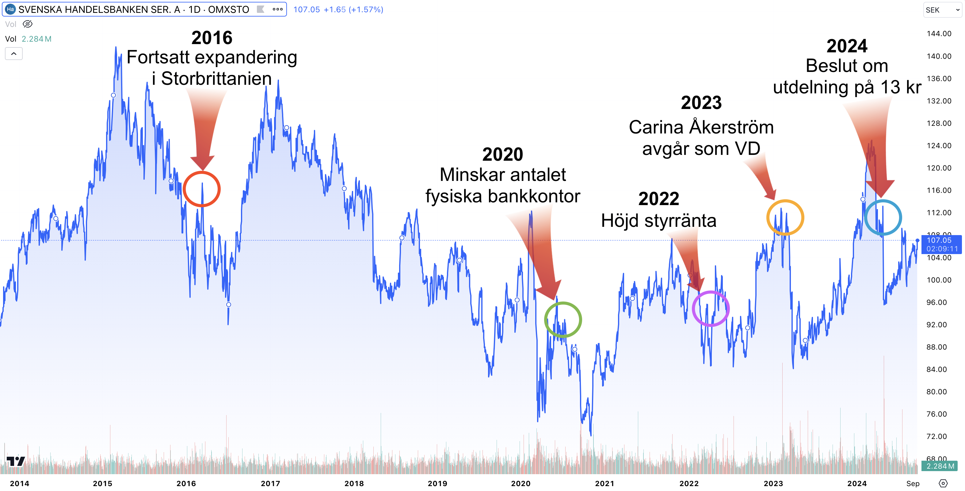 Detta kapitel ger en överblick över hur SHB:s A-aktie (SHB A) utvecklats mellan 2014 och 2024. Diagrammet nedan markerar 5 nyckelhändelser som haft en betydande påverkan på bolagets verksamhet och aktiekurs på både kort och lång sikt. En djupare analys av dessa händelser går att läsa om nedanför diagrammet.