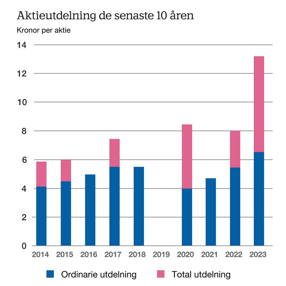 - 2024 – Vid årsstämman den 20 mars 2024 beslutades en utdelning på 13 kronor per aktie, varav hälften i form av en extra utdelning. Den första utdelningen skedde under våren 2024 och den andra kommer att ske under hösten.