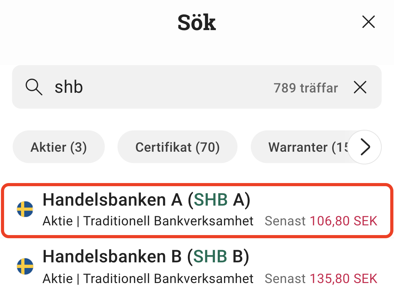Har du pengar på ditt konto? Då klickar vi på sökknappen, och söker efter SHB aktie. Bilden nedan visar att SHB har två typer av aktier. Den första (SHB A) representerar bolagets A-aktie. Den andra (SHB B) representerar deras B-aktie. I detta exempel väljer vi att handla Handelsbankens A-aktie.
