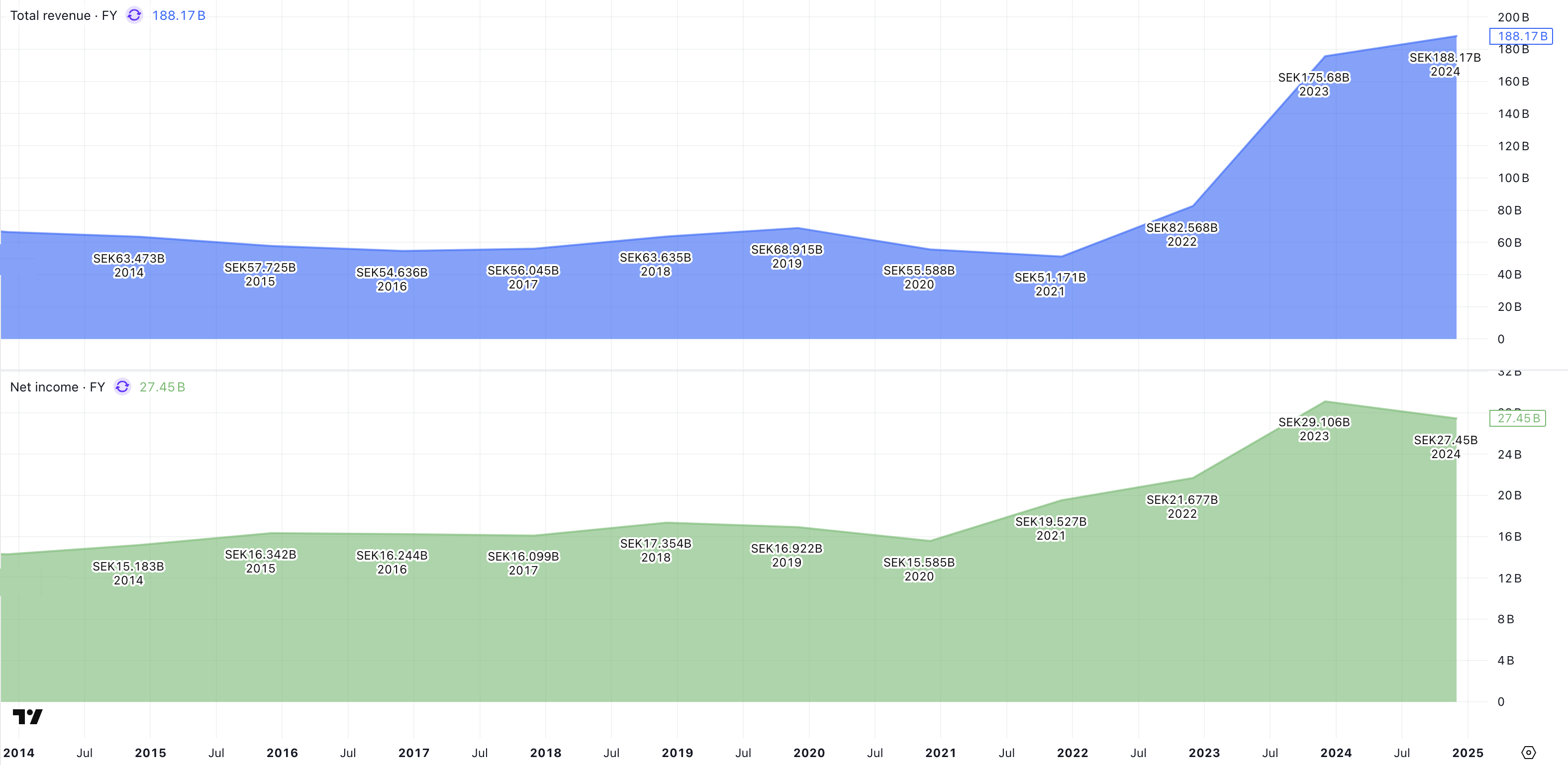 Bilden ovan visar hur både omsättningen och vinsten steg kraftigt efter att styrräntan stigit sedan maj 2022. Resultatet kom inte att synas ordentligt förrän räkenskapsåret 2023 då bolaget redovisade ett rekordresultat.