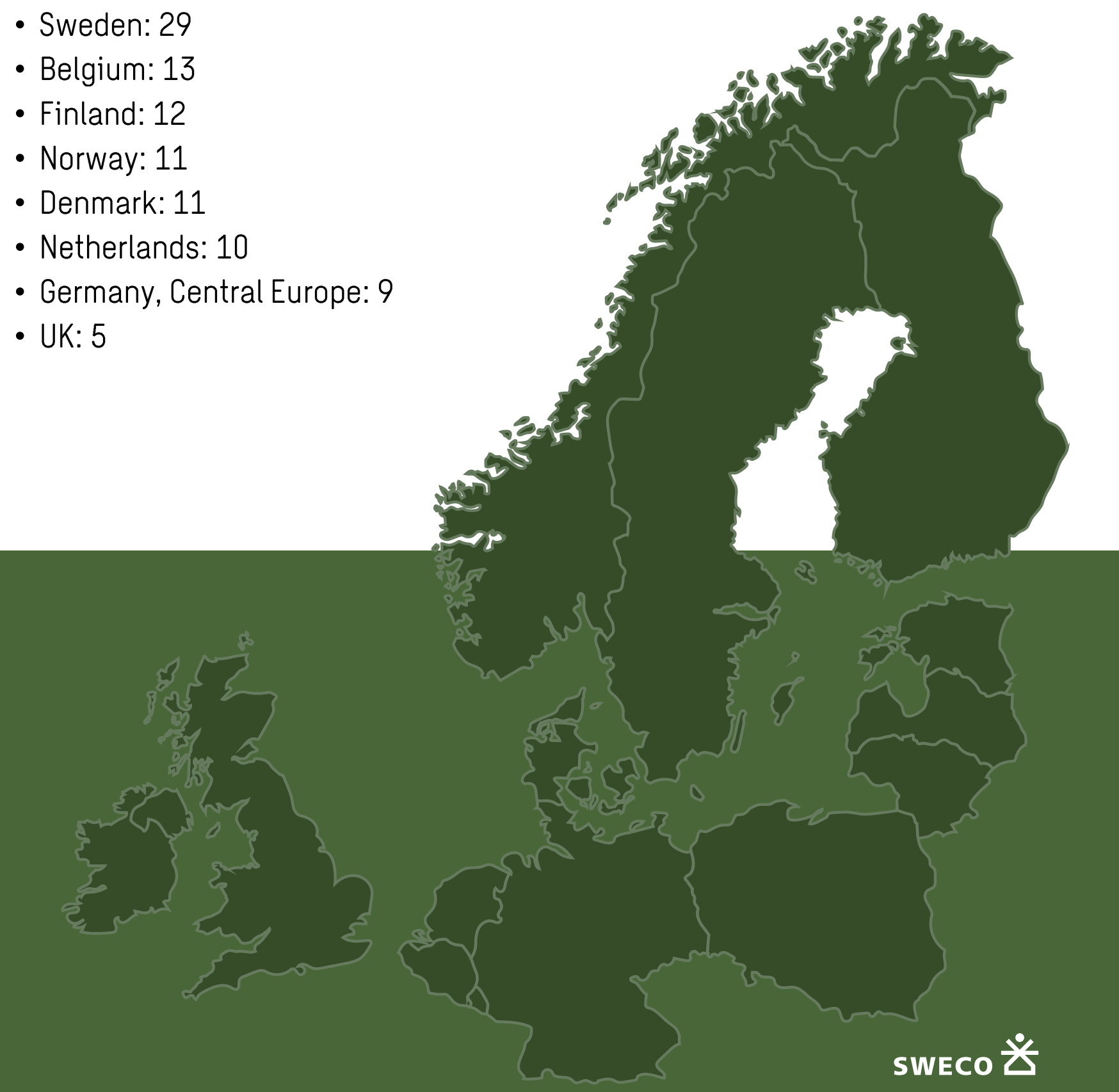- Storbritannien – Swecos marknadsposition i Storbritannien fortsätter att vara en av de svagare regionerna på endast 5 % av de totala intäkterna. Trots tidigare förvärv av brittiska bolag, som exempelvis MLM Group, har man inte lyckats expandera sig lika snabbt som på andra marknader.
