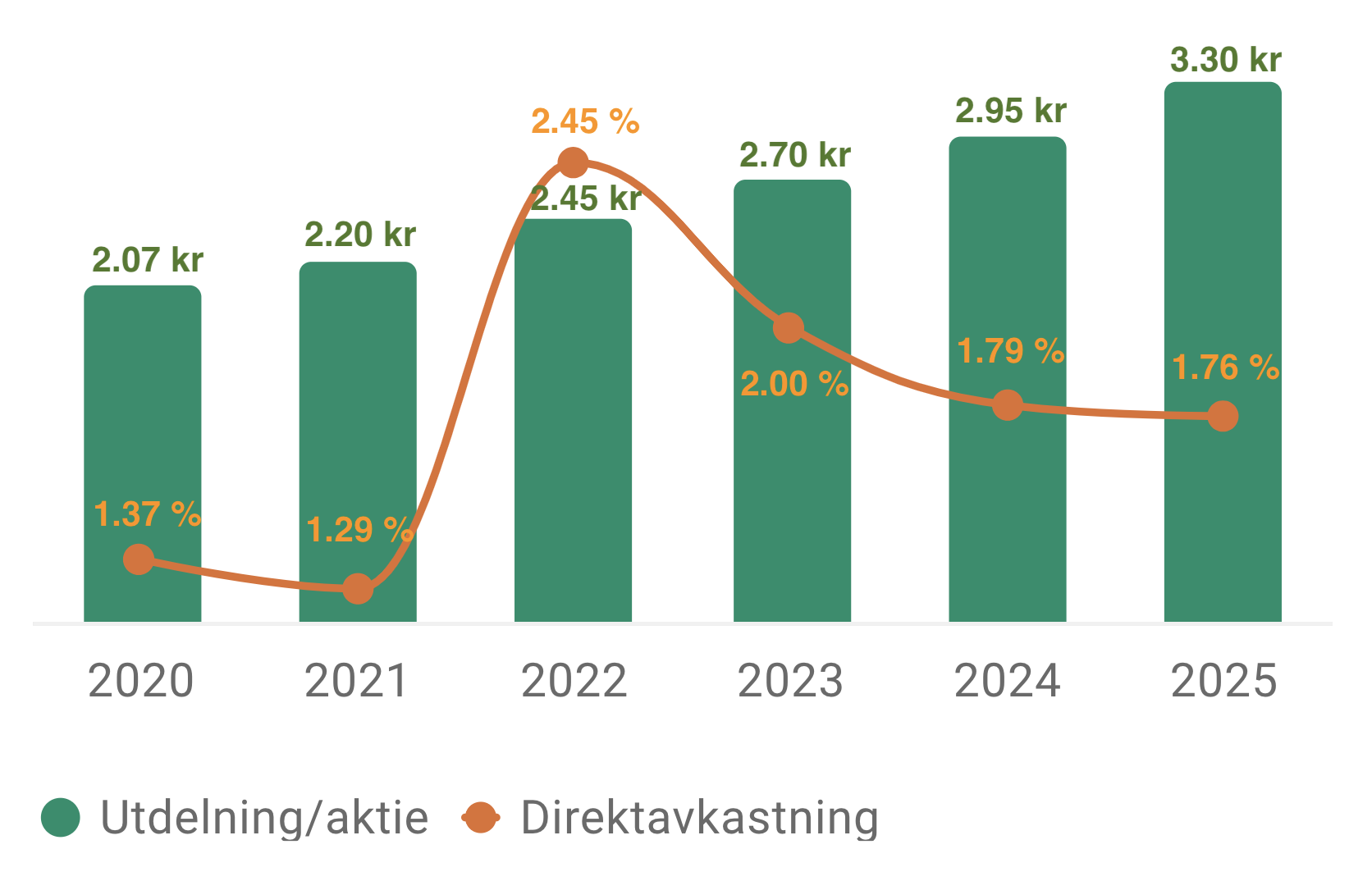 Grafen ovan visar Swecos utdelnings- och direktavkastningstrend, mellan 2020 och 2025. Notera att utdelningen kommer från det redovisade resultatet från föregående år. Utdelningen år 2025 kommer alltså från resultatet som redovisades år 2024.