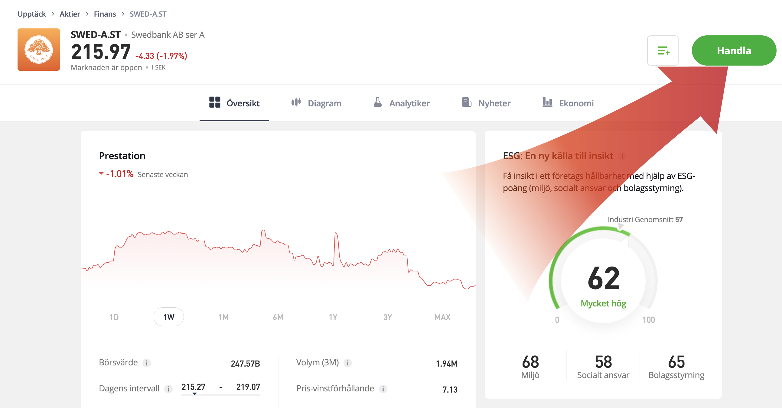 Swedbank finns att handla hos både eToro och Avanza. Deras aktie finns noterad på Stockholmsbörsen och tillhör OMXS30-indexet. Längre ner i guiden visar vi steg-för-steg hur du köper aktier i bolaget. Läs mer i kapitel 5.