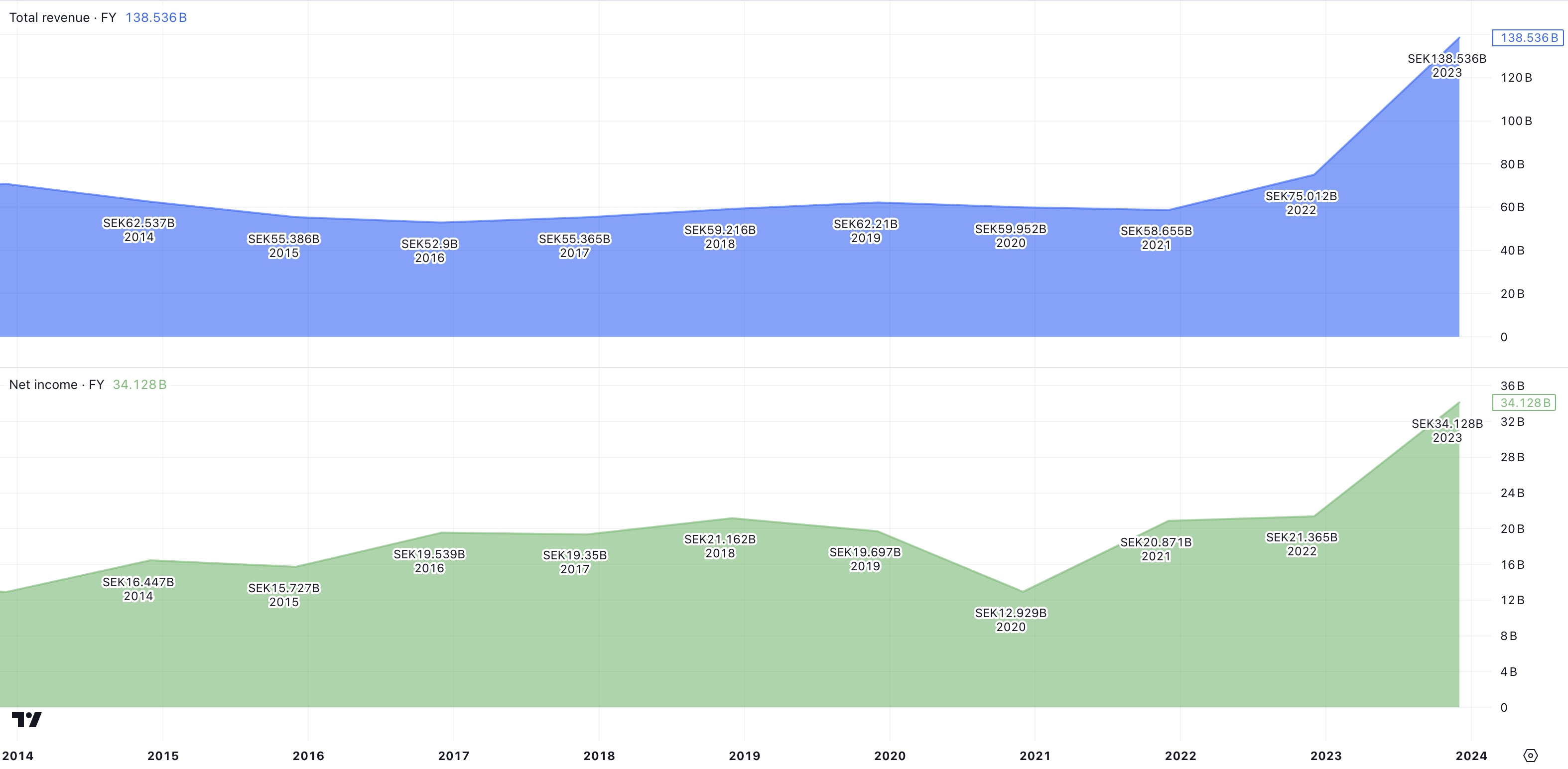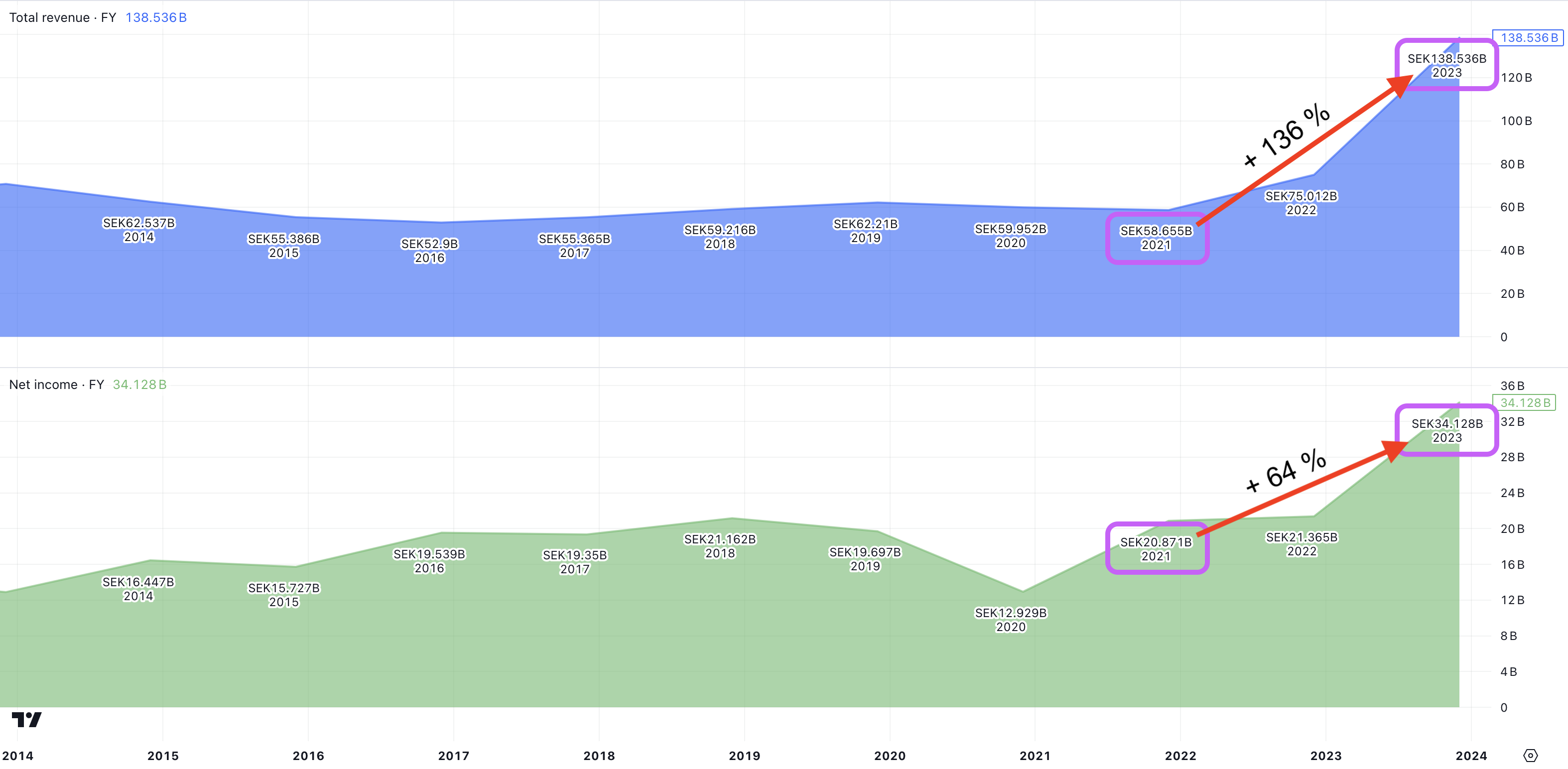 Omsättningen ökade från 58,66 miljarder SEK till 138,54 miljarder SEK, mellan 2021 och 2023. Det är en ökning med cirka 136 %. Under samma period steg vinsten från 20,87 miljarder SEK till 34,13 miljarder SEK, vilket motsvarar en ökning på cirka 64 %.