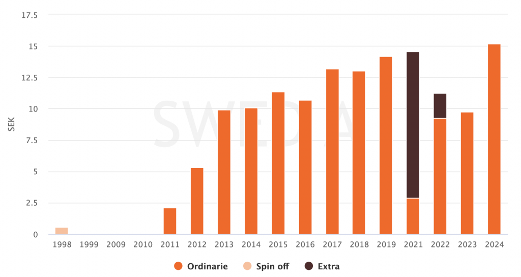 Stapeldiagrammet ovan illustrerar Swedbanks utdelningshistorik från 1998 till 2024. För år 2011 uppgick utdelningen per aktie till 2.10 SEK, medan den för 2023 hade ökat till 15.15 SEK. Detta motsvarar en genomsnittlig årlig tillväxt på strax över 15 %.