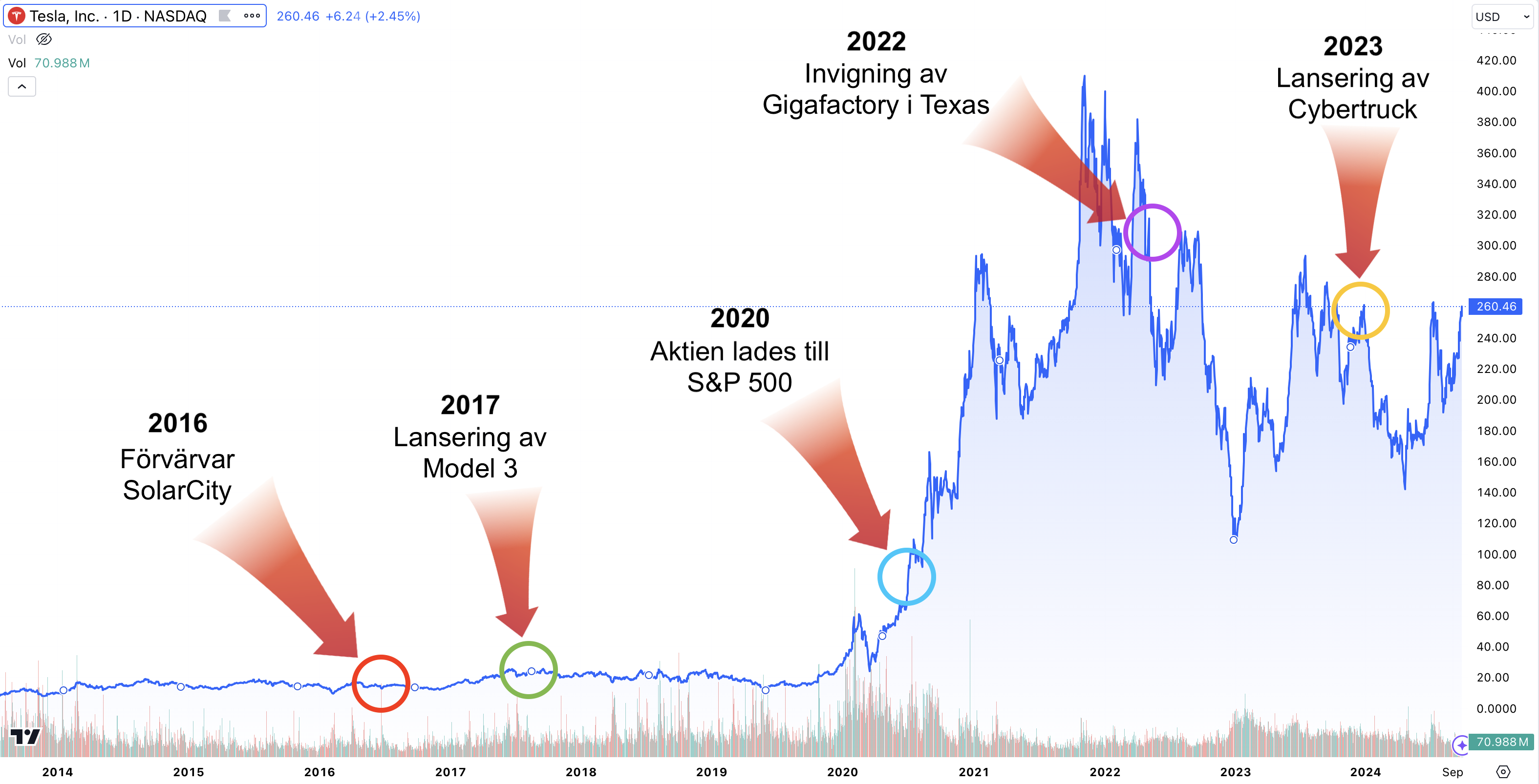 Detta kapitel ger en sammanfattning av Teslas aktiekursutveckling under perioden 2014 till 2024. Grafen nedan visar 5 viktiga händelser som starkt påverkat bolagets prestation och aktiekursrörelser. För en mer djupgående genomgång av dessa händelser, finns ytterligare detaljer om dem längre ner efter grafen.