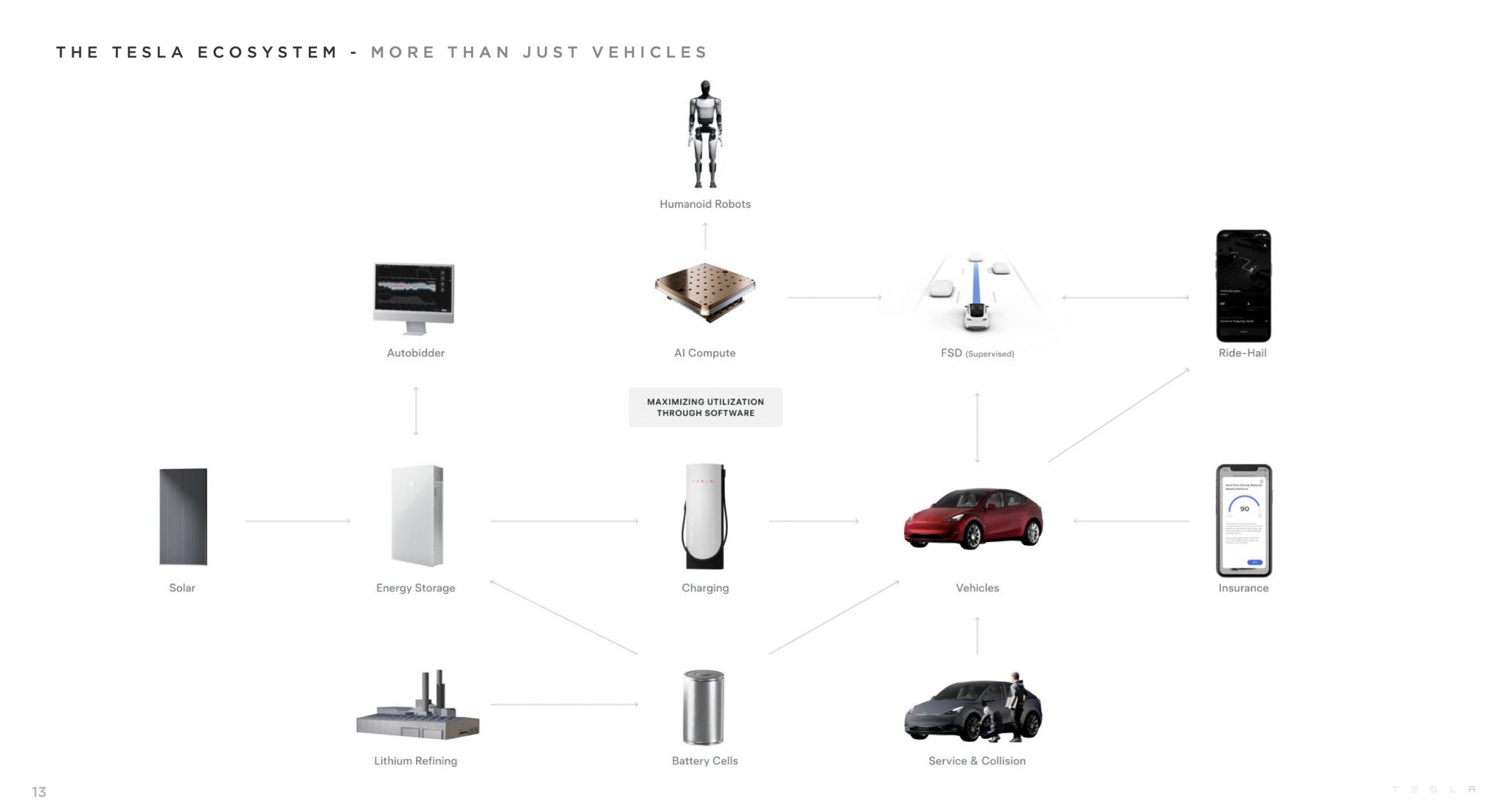 Cathie Wood ska ha påstått att Elon Musk är vår generations största geni. Enligt henne kommer Elon att bli världens första biljonär, i takt med att bolagets aktier växer i värde. Bilden nedan visar områden som Tesla arbetar inom och vilka tillsammans skapar vad de kallar för sitt eget ekosystem.