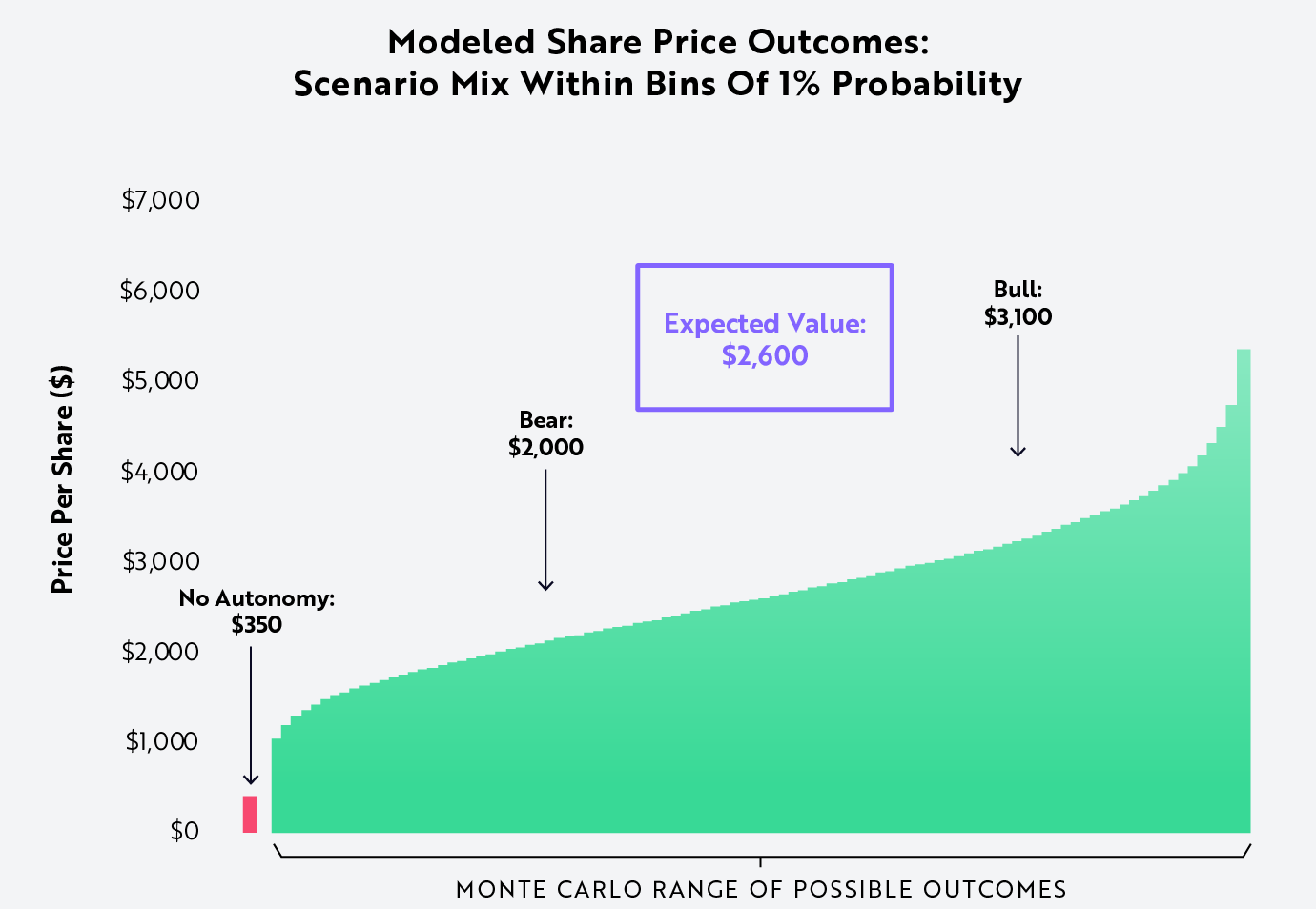 Bilden nedan visar ARK Invests ”bear”, ”base” och ”bull case” scenarion. Enligt deras sämsta scenario (bear) tror man att en Tesla-aktie kan vara värd 2 000 USD, år 2029. Enligt deras bästa scenario (bull) kan aktien ha möjlighet att stiga till 3 100 USD.