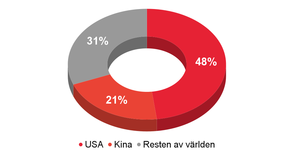 Cirkeldiagrammet ovan visar hur omsättningen är fördelad mellan olika geografiska marknader. Den klart största marknaden är Teslas hemmamarknad, USA, vars andel uppgår till 48 % av den totala försäljningen. Därefter kommer Kina med en andel på 21 %, följt av resten av världen på 31 %.