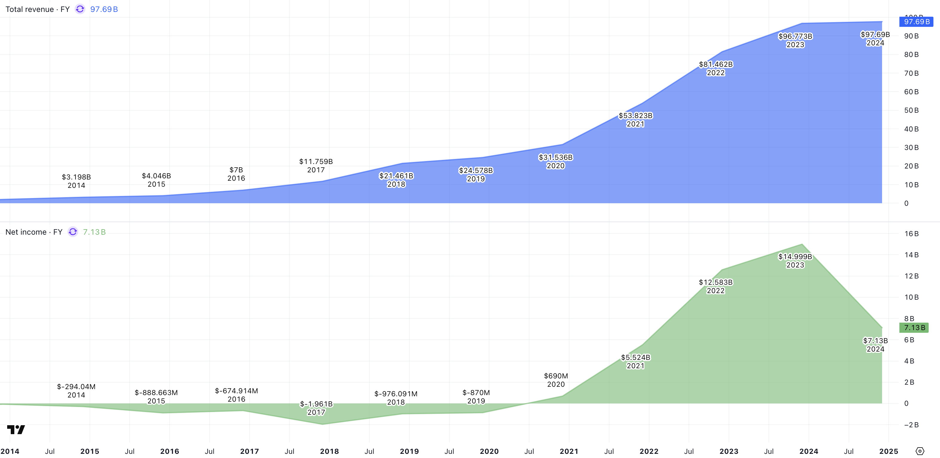 År 2014 uppgick Teslas omsättning till totalt 3,20 miljarder USD. År 2024 uppgick den till 96,69 miljarder USD. Det är lika med en genomsnittlig tillväxttakt på cirka 41 % per år. Det är en makalös tillväxttakt som kategoriserar Tesla som en tillväxtaktie.