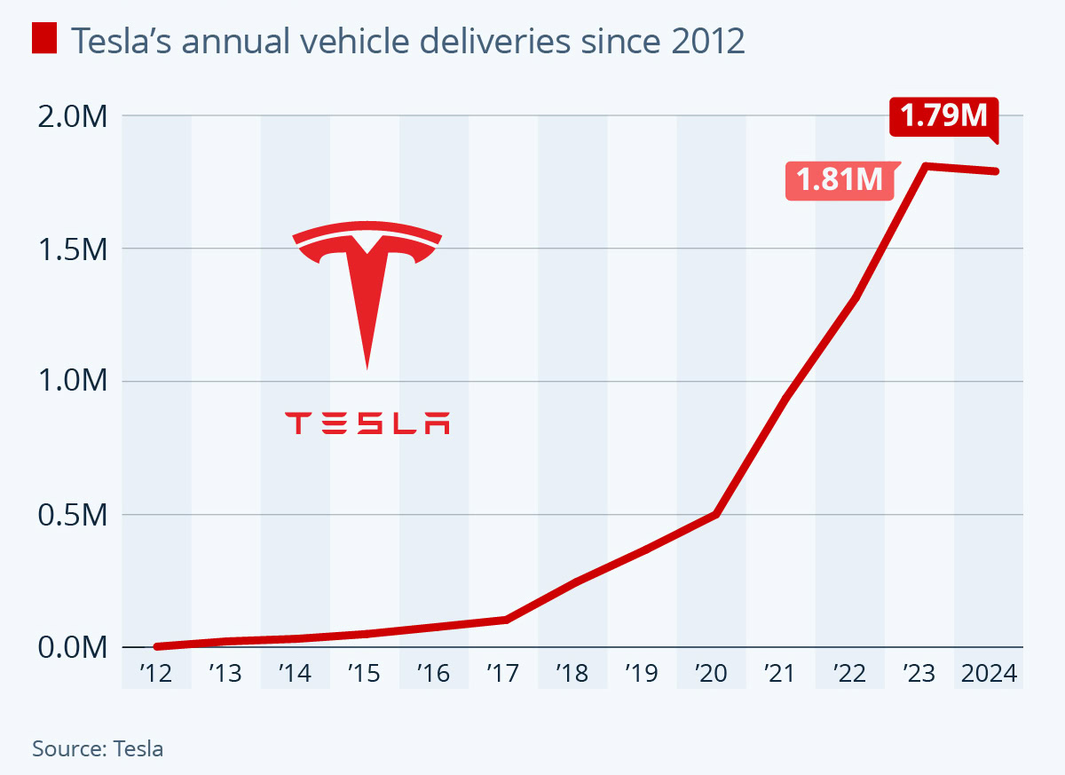 Bilden ovan illustrerar antalet sålda fordonsenheter per år, mellan 2012 och 2024. År 2012, då de lanserade model S, sålde Tesla totalt 3 000 enheter. År 2024 sålde bolaget totalt cirka 1,79 miljoner bilar. Det är lika med en ackumulerad genomsnittlig tillväxttakt på cirka 70 % per år.