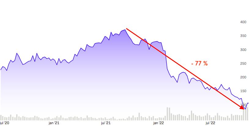 Som en effekt av de negativa marknadsprognoserna sjönk Metas aktie från rekordhöga 382 USD till ungefär 89 USD per aktie. Ett kraftfullt ras på kort sikt. Se bild nedan.