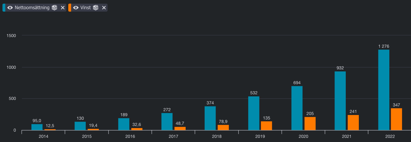 Under sjuårsperioden, mellan 2015 fram till 2022, ökade Fortnox sin omsättning från 130 Mkr till 1 276 Mkr. Det ger en total tillväxt på 882 % och en genomsnittlig årlig tillväxttakt på 38,50 %.