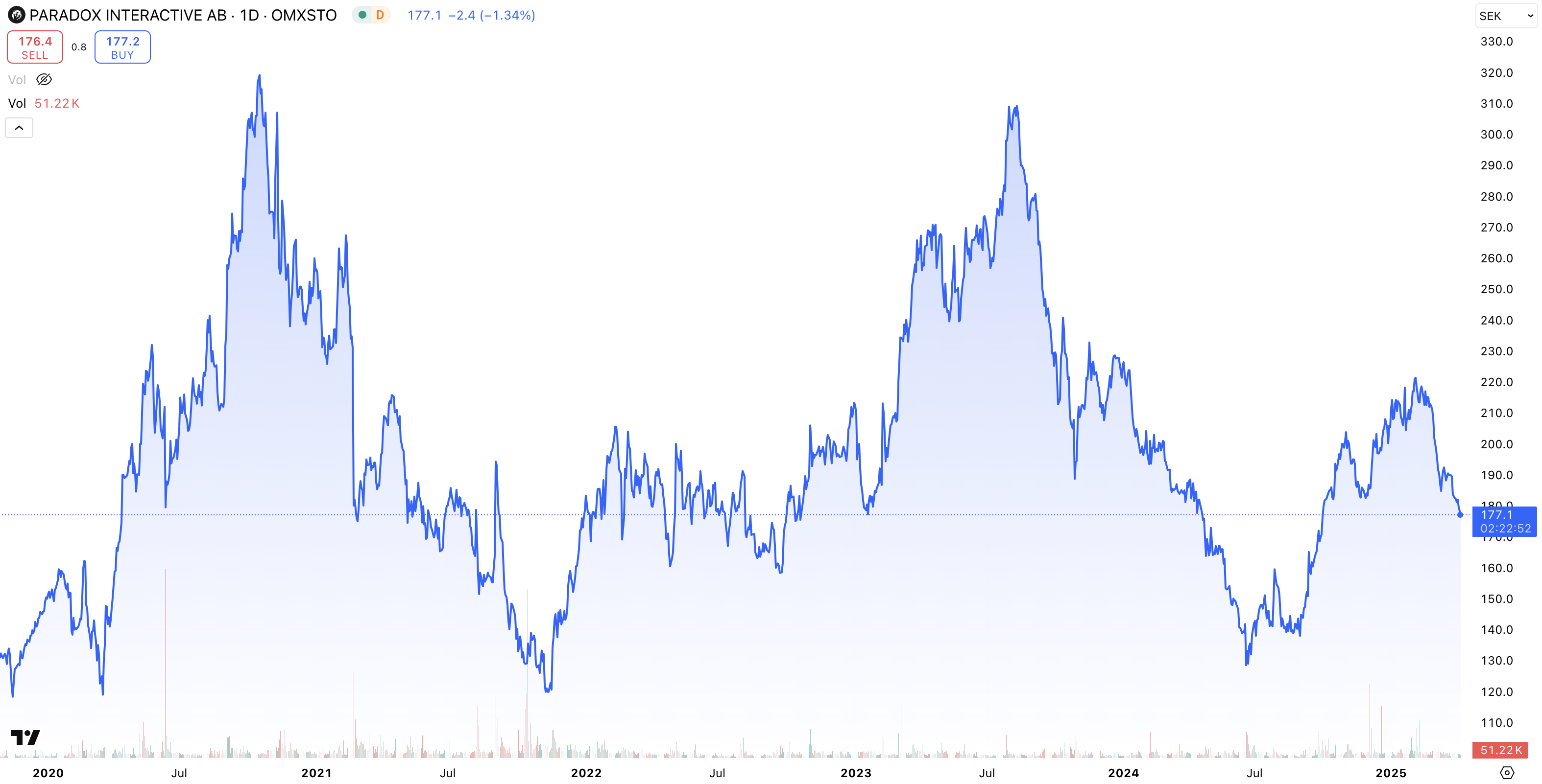 Grafen visar hur kursen stigit kraftigt både 2021 och 2023. Kursstegringen år 2021 kan förklaras av en spekulation i samband med Covid-19 viruset då intresset för aktier och gaming ökade rejält. År 2022/2023 gjorde bolaget rekordvinster, efter ökad försäljning från nylanserade spel som Crusader Kings III och The Lamplighters League.