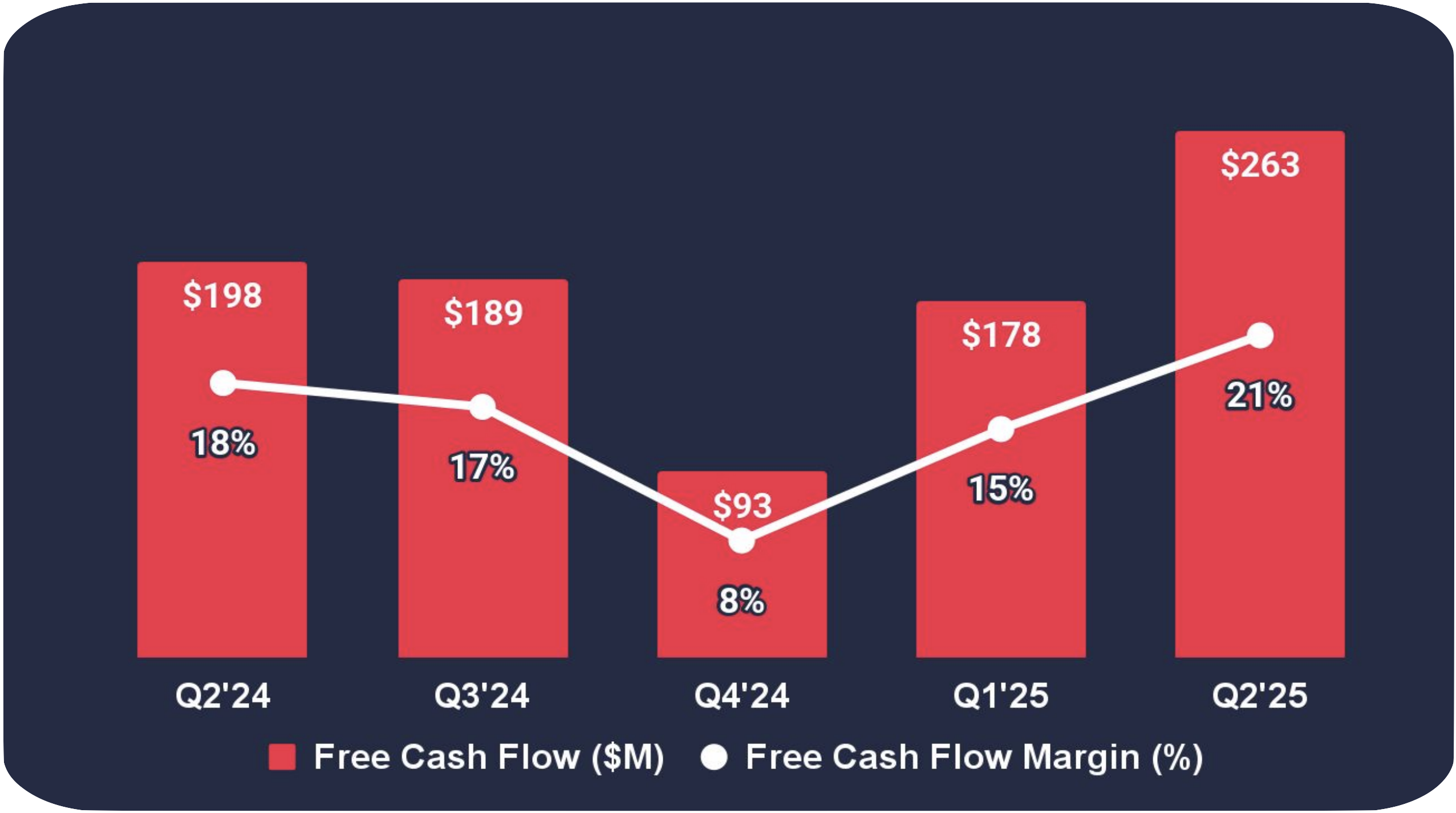 Bilden ovan visar hur Twilios fria kassaflöde och kassaflödesmarginal utvecklats mellan Q2 2024 och Q2 2025. Under perioden ökade det fria kassaflödet från 93 miljoner USD i Q4 2024 till 263 miljoner USD i Q2 2025. Kassaflödesmarginalen steg under samma period från 8 % till 21 %.