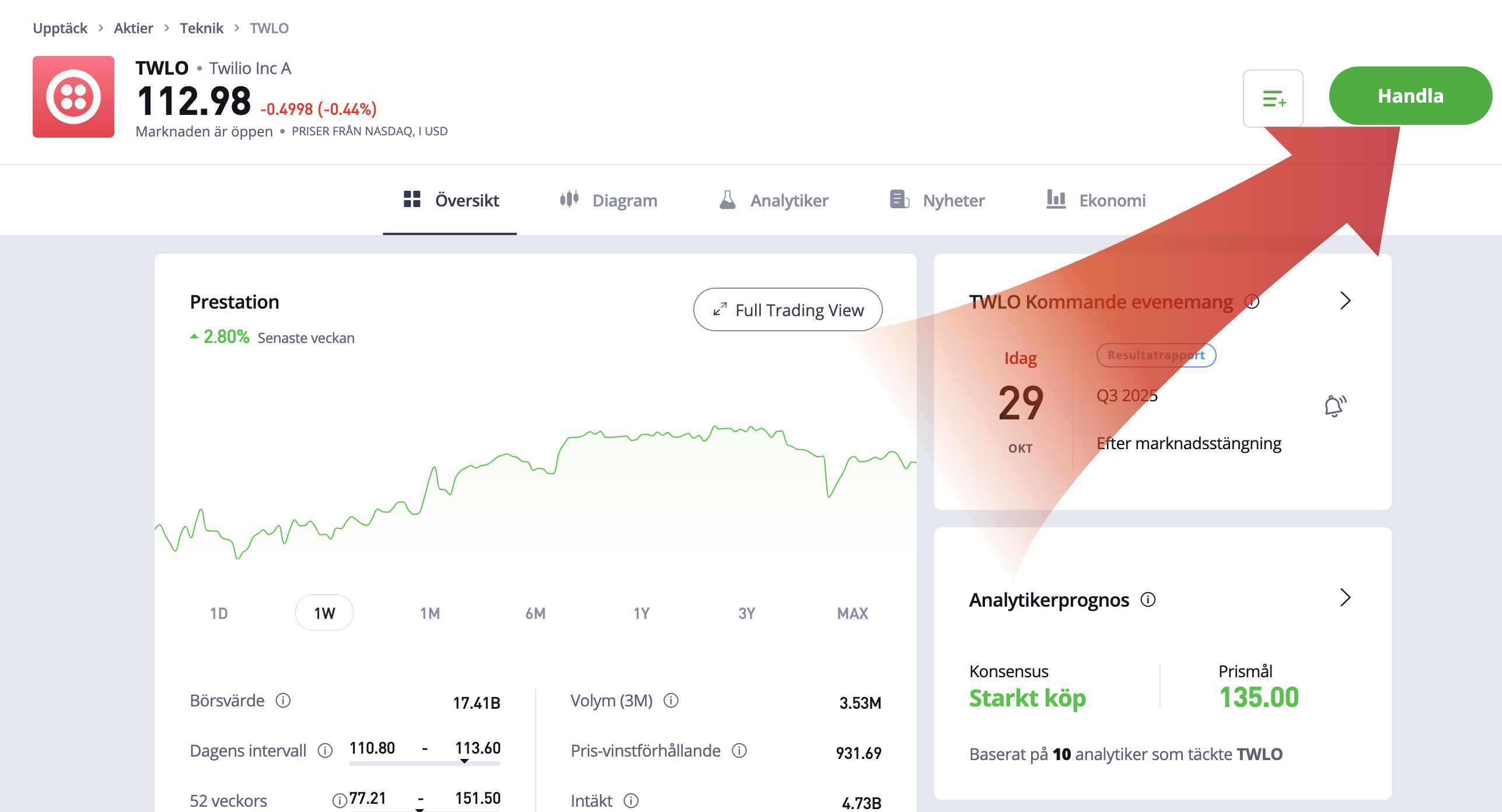 Om du vill följa Twilios aktiekurs i realtid kan du göra det direkt på vår kurssida. Där hittar du också annan viktig information, som bolagets börsvärde och total handelsvolym.