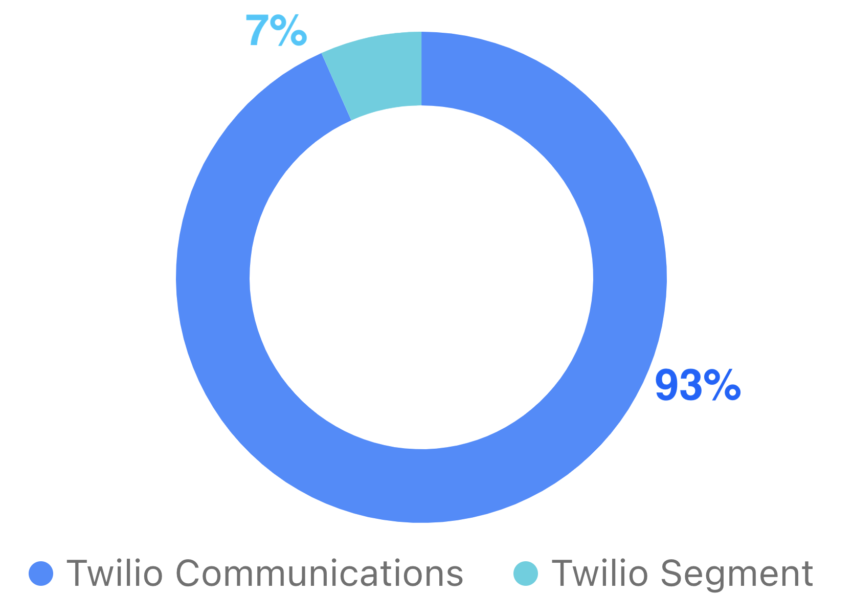 Bilden ovan visar hur Twilios intäkter fördelas mellan bolagets två affärssegment. Det största området, “Twilio Communications”, står för cirka 93 % av omsättningen. Detta segment omfattar företagets molnbaserade kommunikationslösningar som SMS, röst, video, e-post och autentiseringstjänster.