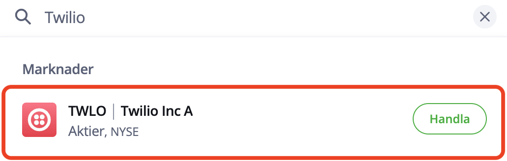 Har du pengar på ditt konto? Då klickar vi på sökknappen, söker efter Twilio aktie.