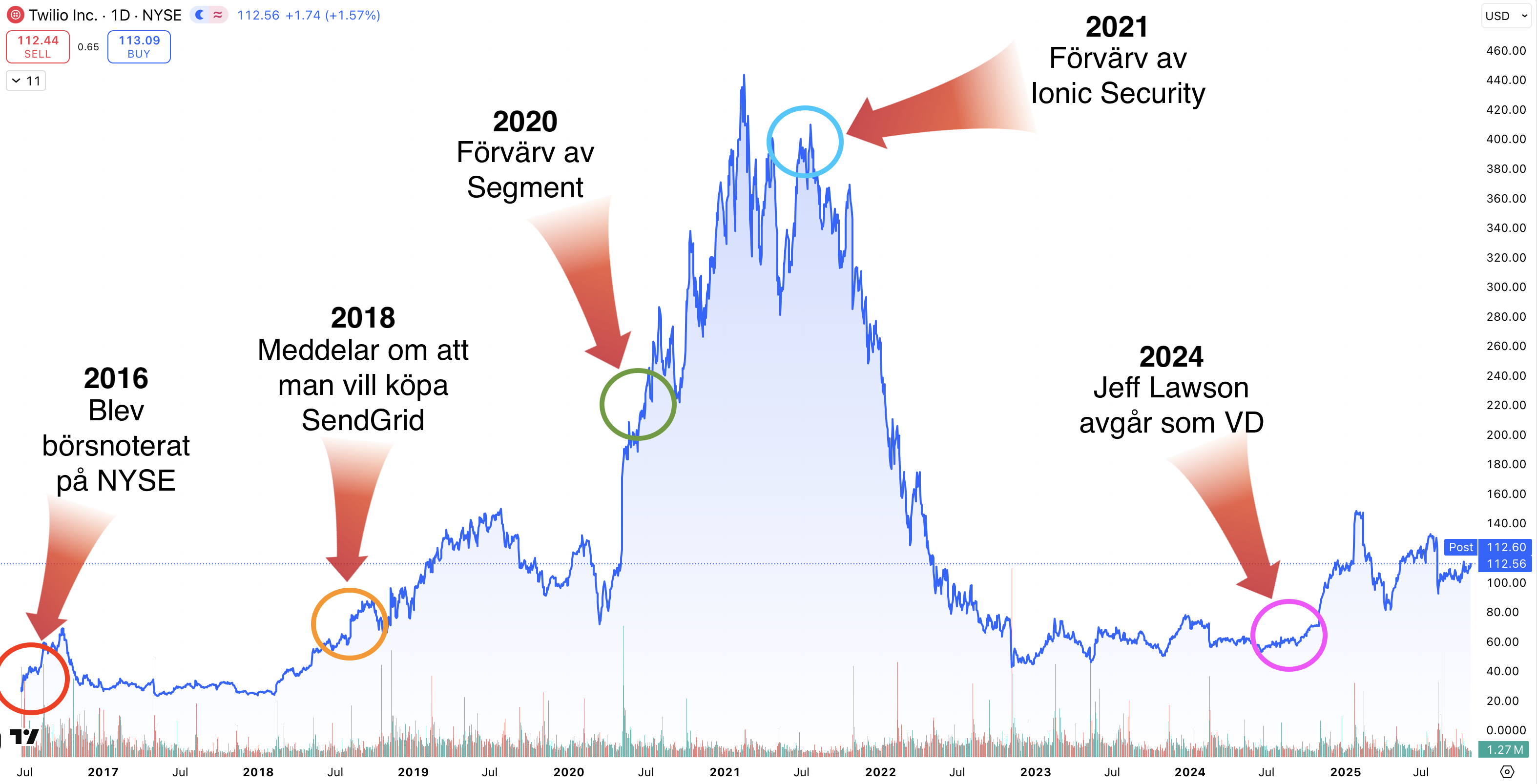 Nedan visas Twilios aktiekursutveckling mellan 2016 och 2025. Diagrammet illustrerar inte bara hur aktiens värde förändrats under perioden, utan lyfter även fram fem centrala händelser som haft stor betydelse för bolagets utveckling inom molnbaserad kommunikation och kunddatahantering.