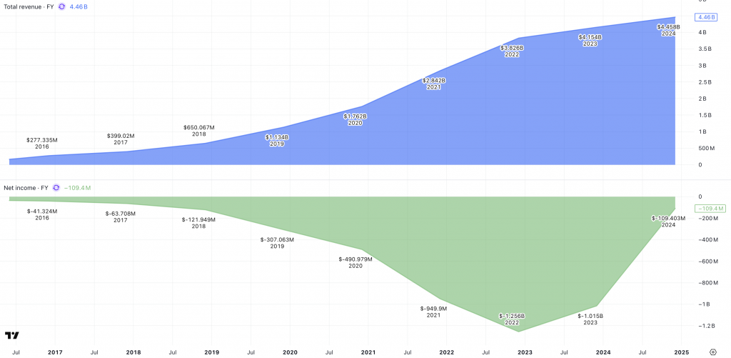 Efter år 2022 har Twilio börjat fokusera mer på kostnadskontroll och att gå mot lönsamhet, vilket syns i en förbättrad vinstkurva mot slutet av perioden. År 2024 har bolaget bytt VD, med syfte att satsa mer på lönsamhet. Sammantaget speglar grafen hur bolaget gått från snabb tillväxt till ett starkare fokus på hållbar lönsamhet.