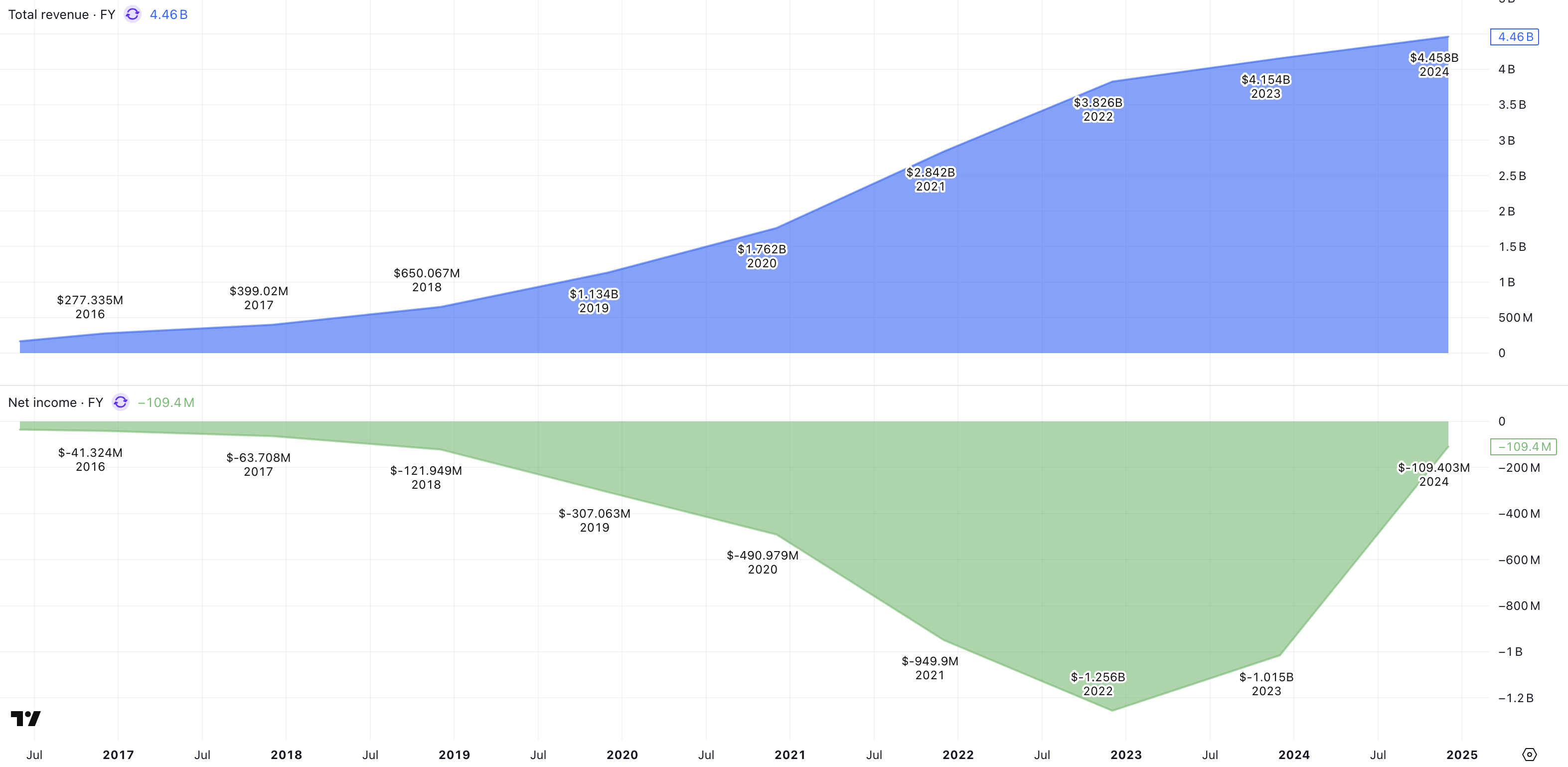 Grafen ovan visar hur Twilios omsättning har vuxit kraftigt sedan 2016, särskilt under pandemin när efterfrågan på digital kommunikation ökade. Vinsten har däremot varierat kraftigt på grund av stora investeringar och förvärv som SendGrid och Segment. Efter 2022 började bolaget fokusera mer på kostnadskontroll och lönsamhet, vilket lett till förbättrade resultat mot slutet av perioden. Läs mer i kapitel 4.