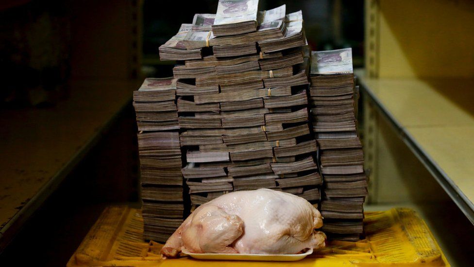 Bilden ovan illustrerar hur inflation fått förödande effekter på den Venezuelanska Bolivar. Antalet sedlar är så mycket som krävs för att kunna köpa en kyckling. Föreställ dig ifall dessa sedlar hade varit 100 kronorssedlar. Hade du haft råd att äta kyckling två gånger i veckan under en hel månad? Förmodligen inte.