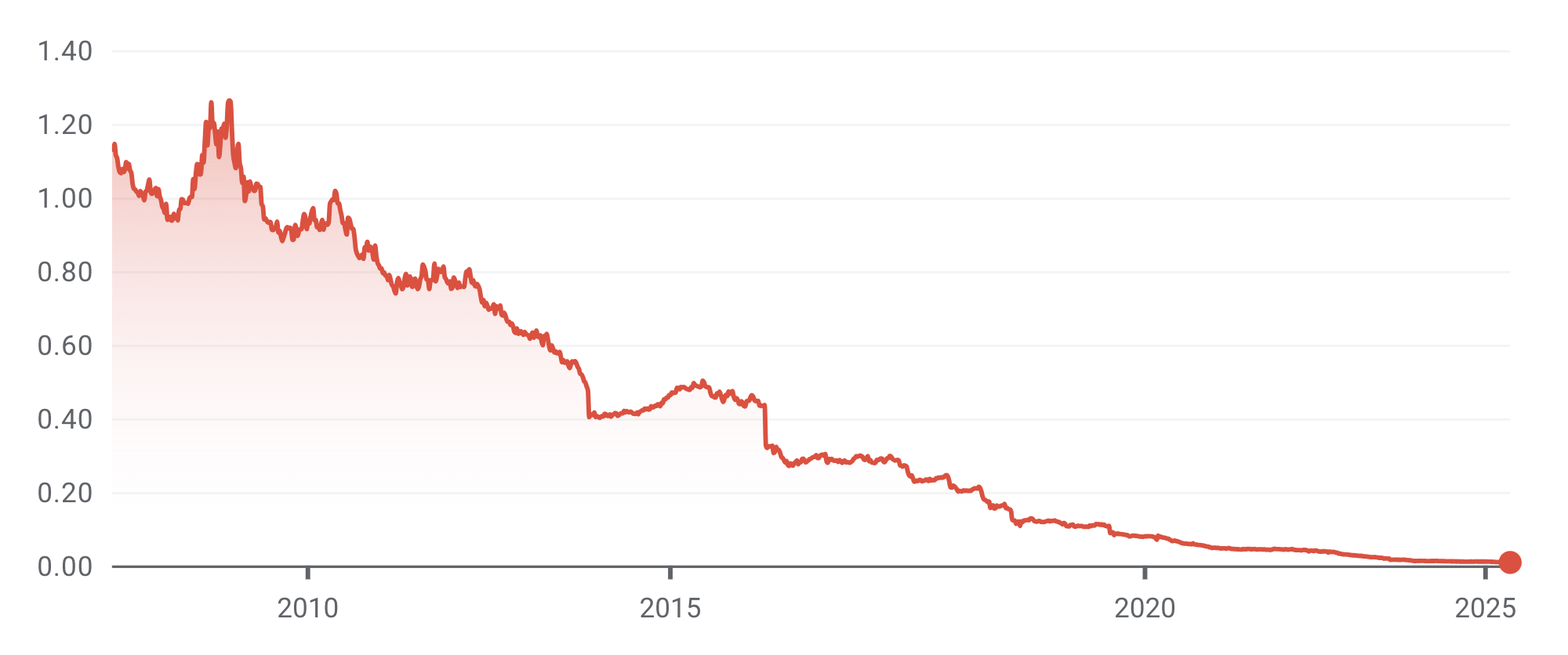 Nedan listas 5 valutakurser som visat på en negativ trend mot den svenska kronan mellan 2020 och 2025.