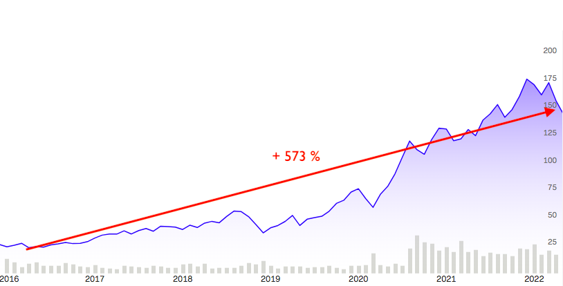Från att en Apple-aktie har varit värd 23.44 USD den 31 mars 2016 stod dess kurs 7 år senare, den 31 mars 2022, i 157.65 USD. Det är en ökning med cirka 573 % (nästan 600 %), vilket motsvarar en genomsnittlig avkastning på cirka 28 % per år.