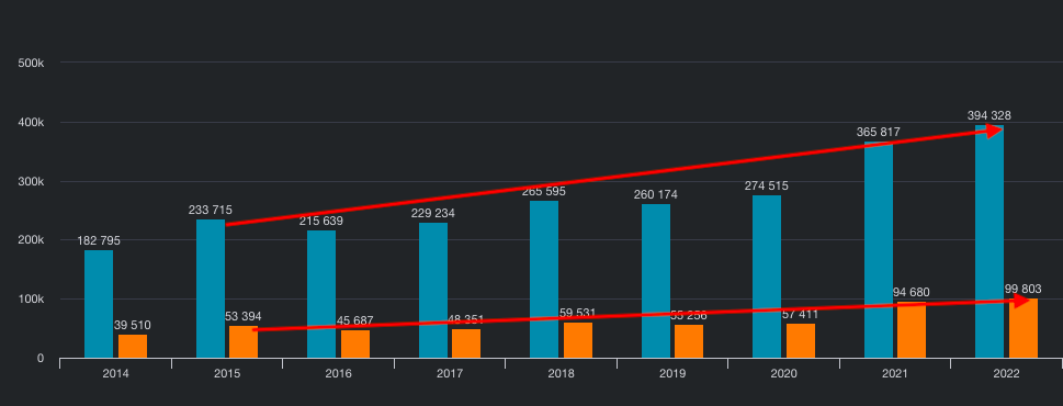 Datan nedan är tagen från Börsdatas screeningverktyg och visar historik för både omsättning (blå) och vinst (orange) mellan 2014 och 2022. Vi kan se att Apple lyckades fördubbla både sin omsättning och vinst sedan 2015.