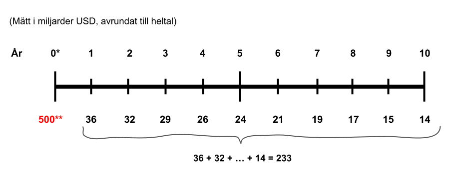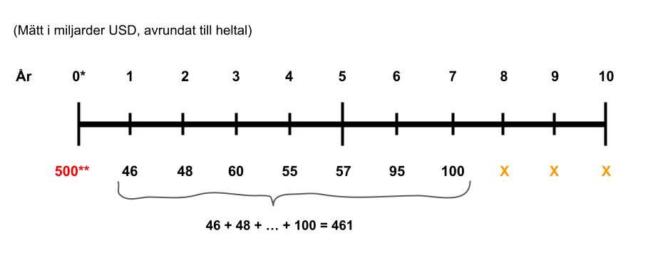 Vi föreställer oss att Apples vinst skulle sjunka med 10 % per år. Det skulle då dröja lite mer än 10 år för att ens få tillbaka cirka hälften av ens investerade kapital. Med att “få tillbaka” menas i form av utdelning, plus värdeutveckling, på börsen. Vi kan ställa upp scenariot enligt följande: