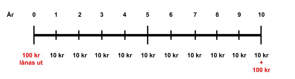 Exempel: Apple (AAPL) ger ut kupongobligationer med en löptid på 10 år. En obligation kostar 100 kr. Varje år betalar Apple 10 % ränta, det vill säga, en kupong på 10 kr per obligation (100 x 0.10). I slutet av perioden betalar Apple tillbaka hela beloppet man lånade på 100 kr. Vad motsvarar det verkliga värdet för en obligation? Svaret är 200 kr (10 x 10 + 100). Se bild nedan.