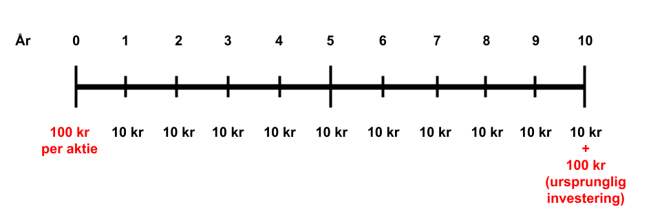 Exempel: Apple (AAPL) ger ut kupongobligationer med en löptid på 10 år. En obligation kostar 100 kr. Varje år betalar Apple 10 % ränta, det vill säga, en kupong på 10 kr per obligation (100 x 0.10). I slutet av perioden betalar Apple tillbaka hela beloppet man lånade på 100 kr. Vad motsvarar det verkliga värdet för en obligation? Svaret är 200 kr (10 x 10 + 100). Se bild nedan.