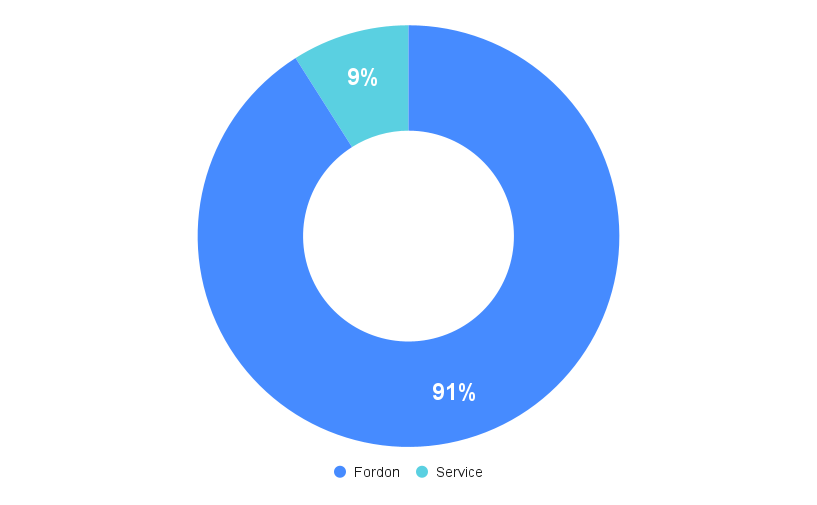 Cirkeldiagrammet ovan visar fördelningen av XPengs intäkter från försäljning av fordon och tjänster. Försäljning av fordon utgör den största andelen av intäkterna, med en stadig andel på över 91 %. Försäljningen av tjänster står för endast 9 % av intäkterna. Fordonssegmentet utgör således det viktigaste.
