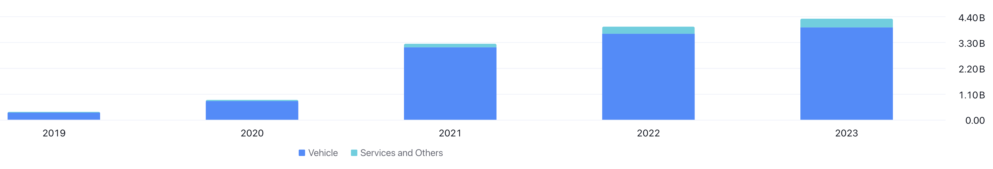 Stapeldiagrammet ovan visar tillväxten av de totala intäkterna och per segment. År 2019 uppgick intäkterna från “Fordon” till 314 miljoner USD. År 2023 uppgick de istället till 3 950 miljoner USD. Det är lika med en ackumulerad genomsnittlig tillväxt på 88 % per år.