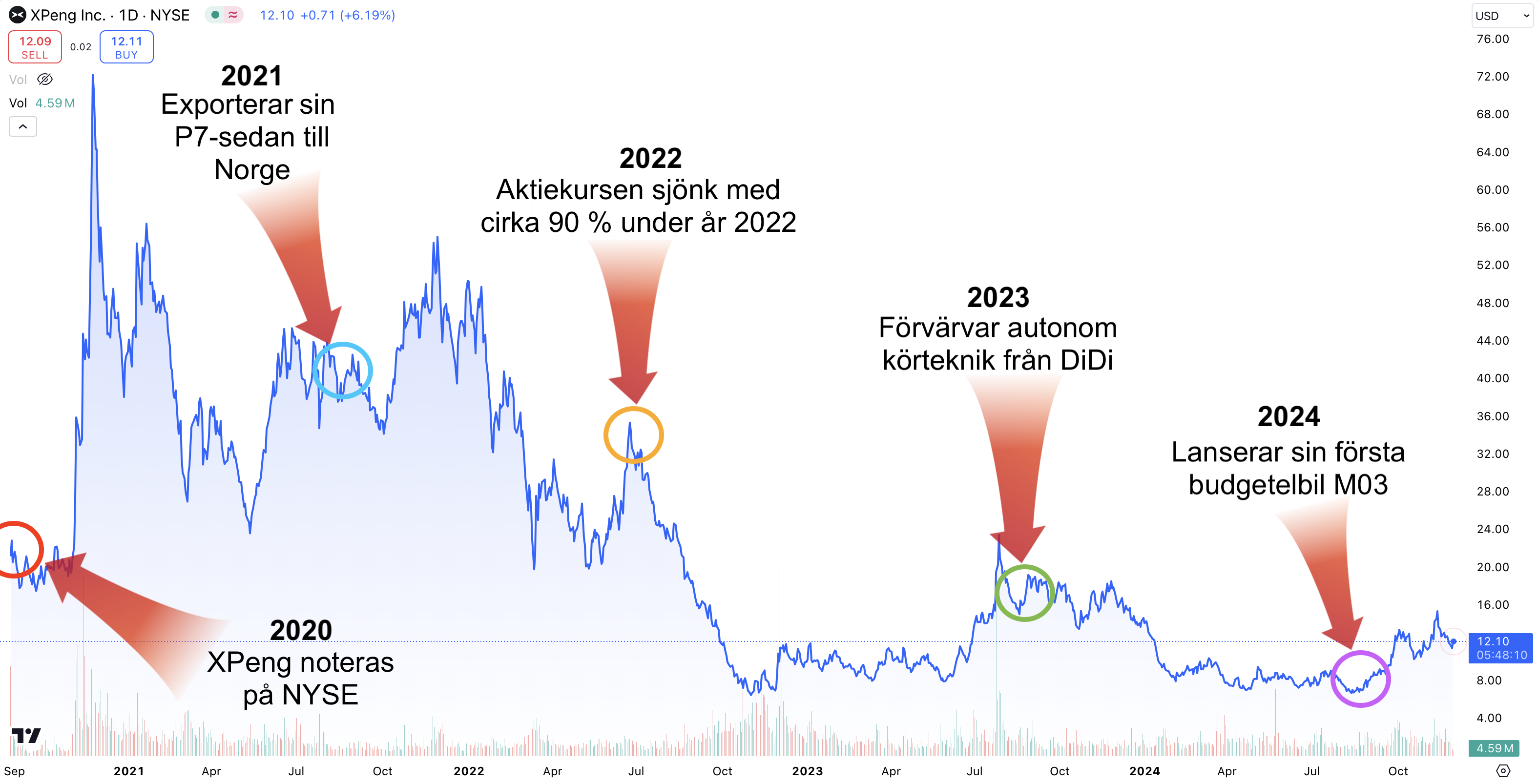 Grafen nedan illustrerar utvecklingen av XPengs aktiekurs under perioden 2020 till 2024. Totalt visas 5 betydande händelser i diagrammet som har påverkat företagets resultat och aktiekurs. Utförliga beskrivningar av dessa händelser finns att läsa längre ner i texten.