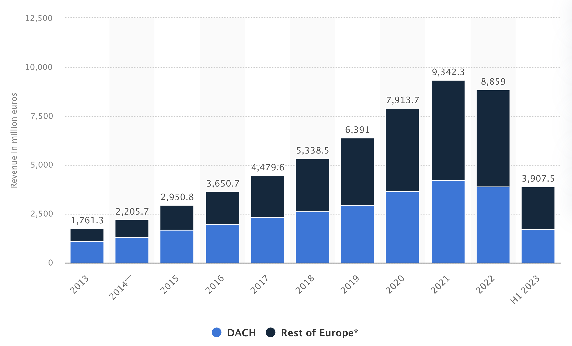 Grafen ovan visar Zalandos intäkter fördelade över två geografiska områden: DACH-regionen (Tyskland, Österrike och Schweiz) och resterande Europa. Detta för perioden 2013 in på första halvåret av 2023. Vid tillfället då bilden togs fanns ingen data tillgänglig för helåret 2023.