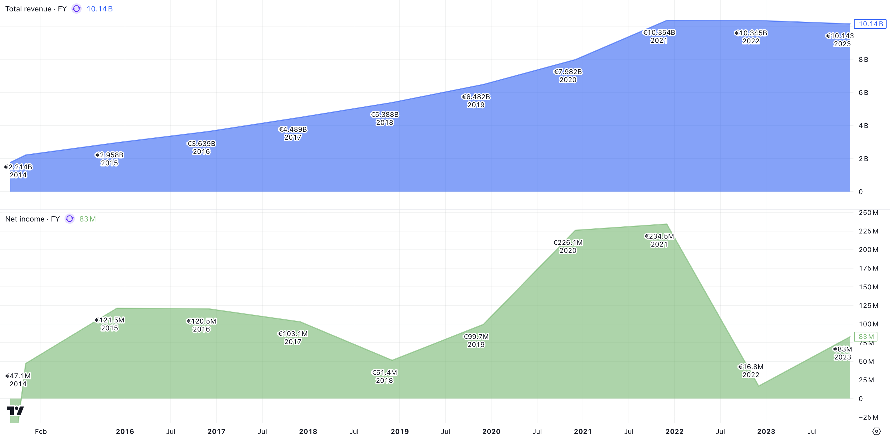 Vinsten har varierat mycket mer än omsättningen, från år till år. Under de första åren (2014 – 2017) höll sig vinsten relativt stabil. Den började dock sjunka 2018 då den nådde en botten med endast 51,4 miljoner EUR i vinst. Det berodde på ökade kostnader för expansion, marknadsföring och logistik.