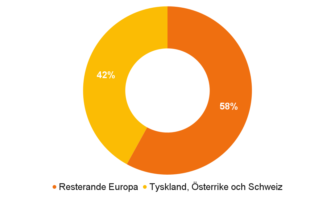 • Tyskland, Österrike och Schweiz (DACH) – DACH-regionen är Zalandos mest mogna region. Intäkterna härifrån motsvarar ungefär 42 % av bolagets totala omsättning. Zalando har en hög marknadspenetration inom DACH-regionen. Fokus här ligger på att förbättra lönsamheten genom ökad effektivitet och starka kundrelationer. Regionen har en hög andel av kunder som använder premiumtjänster som Zalando Plus, vilket bidrar till stabila intäkter och lojalitet.