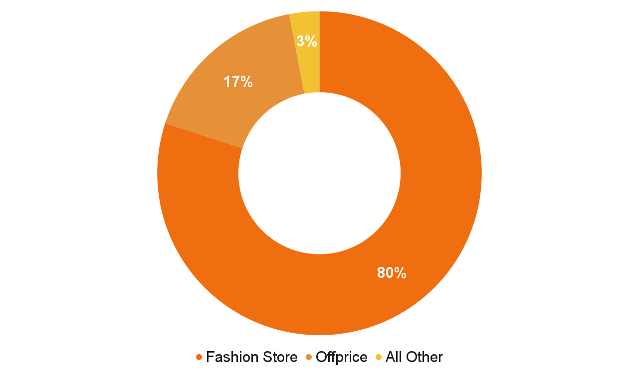 Cirkeldiagrammet ovan visar på Zalandos intäktsfördelning per affärssegment. Det huvudsakliga segmentet, som inkluderar deras e-handelsplattform, står för 80 % av intäkterna. Detta följt av “Offprice” på 17 % och “All Other” på endast 3 %. Läs mer i kapitel 3.