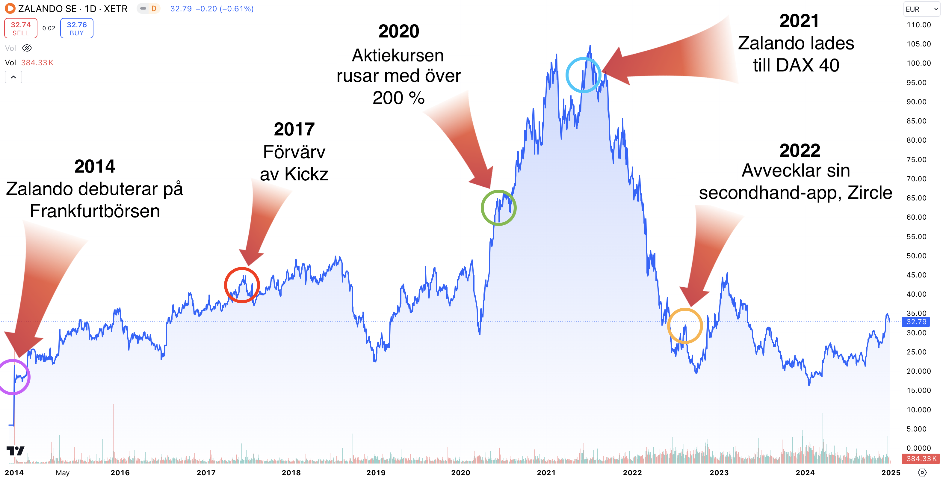 Nedan visas en graf som presenterar Zalandos historiska aktiekursutveckling, mellan 2014 och 2024. Grafen lyfter fram 5 viktiga händelser som påverkat både bolagets prestation och aktiekurs. Utförligare information om dessa händelser finns att läsa under grafen.